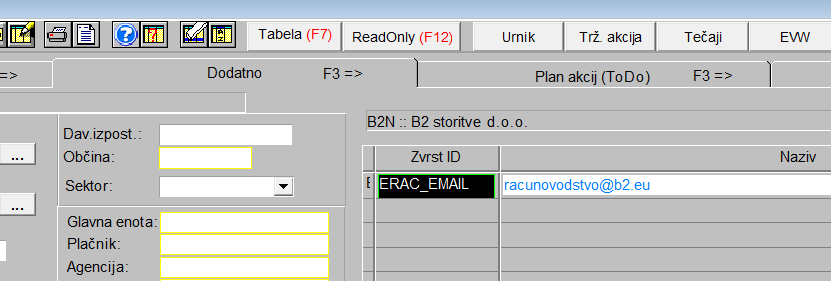 V tem primeru v modulu CRM na zavihku Dodatno pri izbrani stranki dodamo v tabelo Zvrst ID ERAC_EMAIL in v polje Naziv vnesemo e-poštni naslov, na katerega želimo tej stranki pošiljati e-račune.