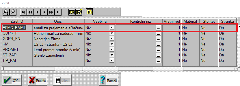 V kolikor zvrsti ERAC-EMAIL še nimamo na izbiro, s kombinacijo tipk Ctrl + preslednica odpremo šifrant in dodamo vrstico, pri čemer pazimo, da pravilno poimenujemo Zvrst ID ERAC_EMAIL in pravilno vnesemo vrednosti v polja Material (Ne), Storitev (Ne) in Stranka (Da).