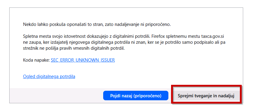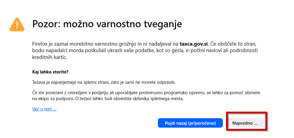 - odvisno od brskalnika, s katerim dostopade do spletnih strani, se lahko pojavi takšno ali podobno varnostno opozorilo: