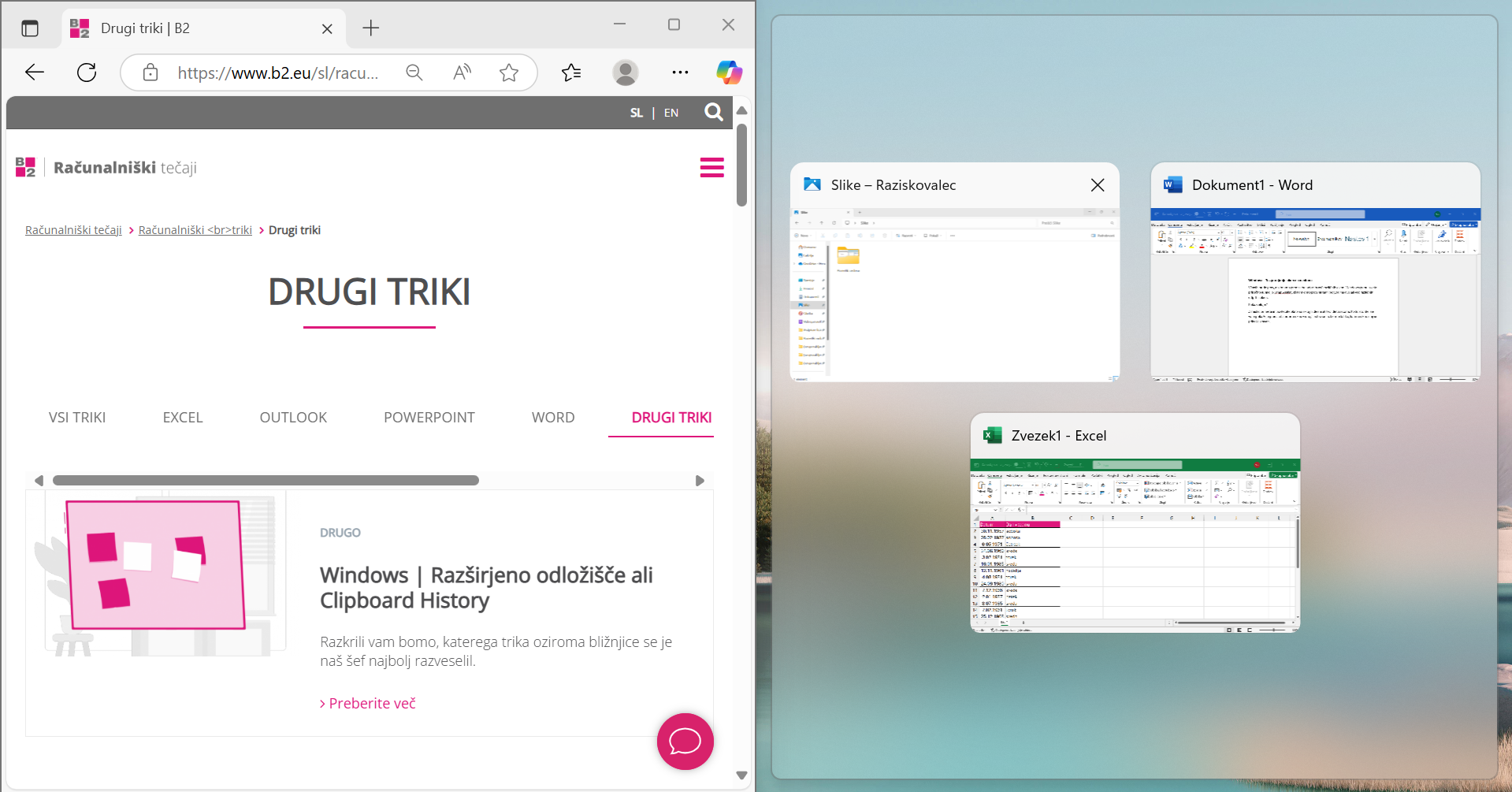 Z miško primete in povlecite okno na skrajni desni ali levi del zaslona. Ko to storite, se vam prikažejo preostala odprta okna v drugi polovici – izberete lahko, katero okno naj se prikaže zraven.
